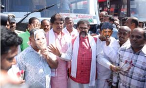ಬೆಂಗಳೂರು: ಸರಕಾರಿ ಬಸ್ ಪ್ರಯಾಣ ದರ ಏರಿಕೆ ಮಾಡಿರುವ ರಾಜ್ಯ ಕಾಂಗ್ರೆಸ್ ಸರ್ಕಾರದ ವಿರುದ್ಧ ಪ್ರತಿಭಟನೆ ನಗರದ ಮೆಜೆಸ್ಟಿಕ್ ನ ಕೆಂಪೇಗೌಡ ಬಸ್ ನಿಲ್ದಾಣದಲ್ಲಿ ಬಿಜೆಪಿ ವತಿಯಿಂದ ವಿನೂತನ ಮಾದರಿಯಲ್ಲಿ ಪ್ರತಿಭಟನೆ ಹಮ್ಮಿಕೊಳ್ಳಲಾಗಿತ್ತು. ಕೆಲವು ಕಾರ್ಯಕರ್ತರು ಮುಖ್ಯಮಂತ್ರಿ ಮತ್ತು ಉಪ ಮುಖ್ಯಮಂತ್ರಿಯವರ