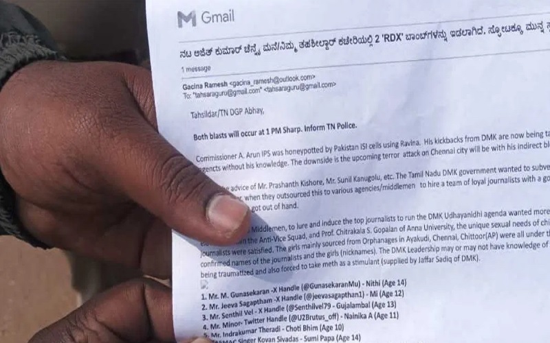 ಡಿ.12ರಂದು ಕೋಲಾರ ಜಿಲ್ಲಾಧಿಕಾರಿ ಕಚೇರಿಗೆ ಬಂದ ಬಾಂಬ್ ಬೆದರಿಕೆ ಇಮೇಲ್ ಬಂದಿತ್ತು, ಜಿಲ್ಲಾಡಳಿತ ಹಾಗೂ ಪೊಲೀಸರು ತಕ್ಷಣ ಕಾರ್ಯಪ್ರವೃತ್ತರಾಗಿ ಶೋಧ ನಡೆಸಿ ಹುಸಿ ಬೆದರಿಕೆ ಎಂದು ಪತ್ತೆ ಮಾಡಿದ್ದರು. ಡಿ.15ರಂದು ಗದಗ ಜಿಲ್ಲಾಡಳಿತ ಭವನ ಸ್ಫೋಟಿಸುವುದಾಗಿ ಡಿಸಿ ಕಚೇರಿಗೆ ಇ-ಮೇಲ್ ಬಂದಿತ್ತು. ಐಎಸ್ಐ ಮತ್ತು ಎಲ್ಟಿಟಿಇ ಕಾರ್ಯಕರ್ತರ ಜೊತೆ ಸೇರಿ 5 ಬಾಂಬ್ ಉಡಾಯಿಸಿ ಜಿಲ್ಲಾಡಳಿತ ಭವನ ಸ್ಫೋಟಿಸುವುದಾಗಿ ಬೆದರಿಕೆ ಬಂದಿತ್ತು.ʼ