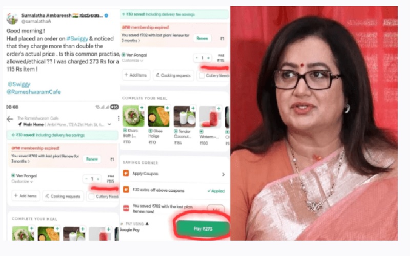 ಪೊಂಗಲ್ ಬೆಲೆ 115 ರೂ., ಸ್ವಿಗ್ಗಿ ವಿಧಿಸಿದ್ದು 273 ರೂ.: ಮಾಜಿ ಸಂಸದೆ ಸುಮಲತಾ ಪೋಸ್ಟ್ ವೈರಲ್